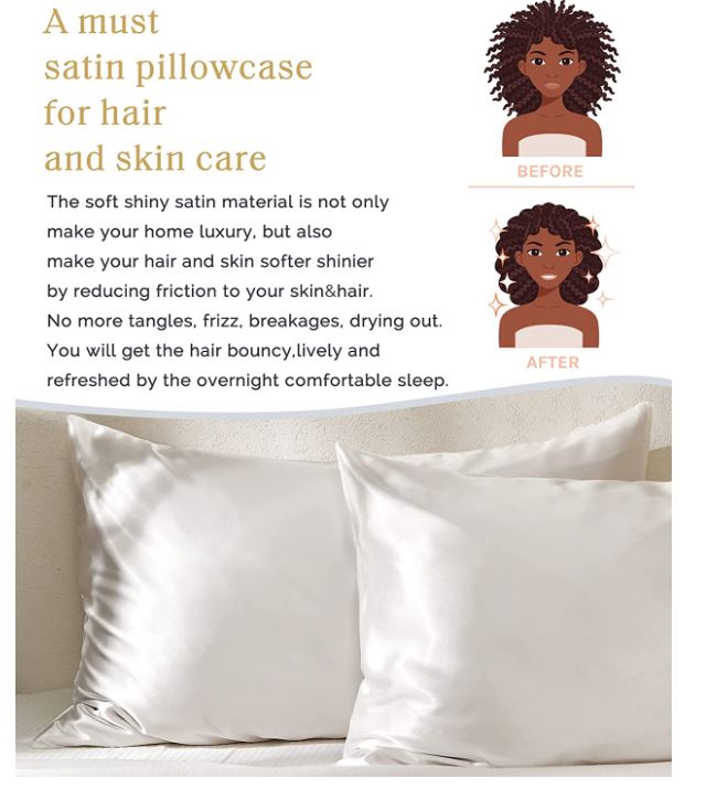 Description At Satinkissesco we have developed the slipperiest satin pillowcases to lay your headon. Our high-quality satin pillowcases are not only great for protecting your hair while you sleep; but also for soothing and protecting your facial skin as you sleep.Our Vegan Beauty Brand offers’ the finest in hair care and skin protection. Try them for yourself and see the difference! Designed to smooth hair with a fabric so slippery that your hair will not be pulled as you turn your head over your pillow during sleep.Your evening facial products will stay on your skin instead of being absorbed away by your pillowcase saving you money. Wake up to smooth frizz free hair and clear clean skin.